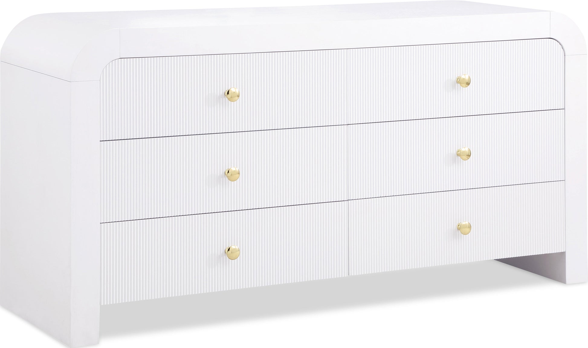 Make organizing a stylish affair when you bring home this Artisto dresser. This beautiful dresser features an elegantly eye-catching design with its rich wood veneer black finish and its textured drawer front designs. Six drawers give you oodles of room for storing items out of sight and out of mind, and the roomy drawers make sure that organizational power is at your fingertips. For versatility, both gold and chrome handles are included with the dresser.