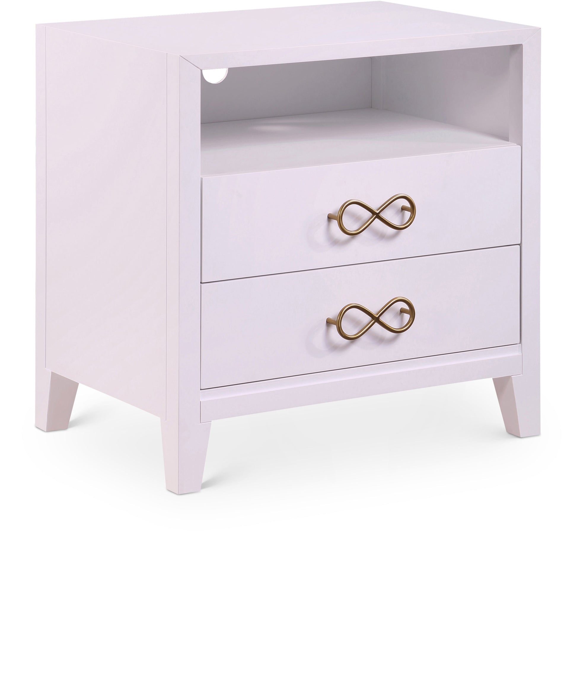 Bring unique elegance to your bedroom with this Bowtie white /gold chest from Meridian Furniture. This night stand features two drawers and a shelf, providing you with plenty of storage space for clothes, linens, or miscellaneous objects. Its white color adds a touch of brightness to your living space, and its brushed gold bow tie handles complement your existing decor. Its flat top is perfect for placing a lamp, framed picture, books, bric-a-brac, and more.
