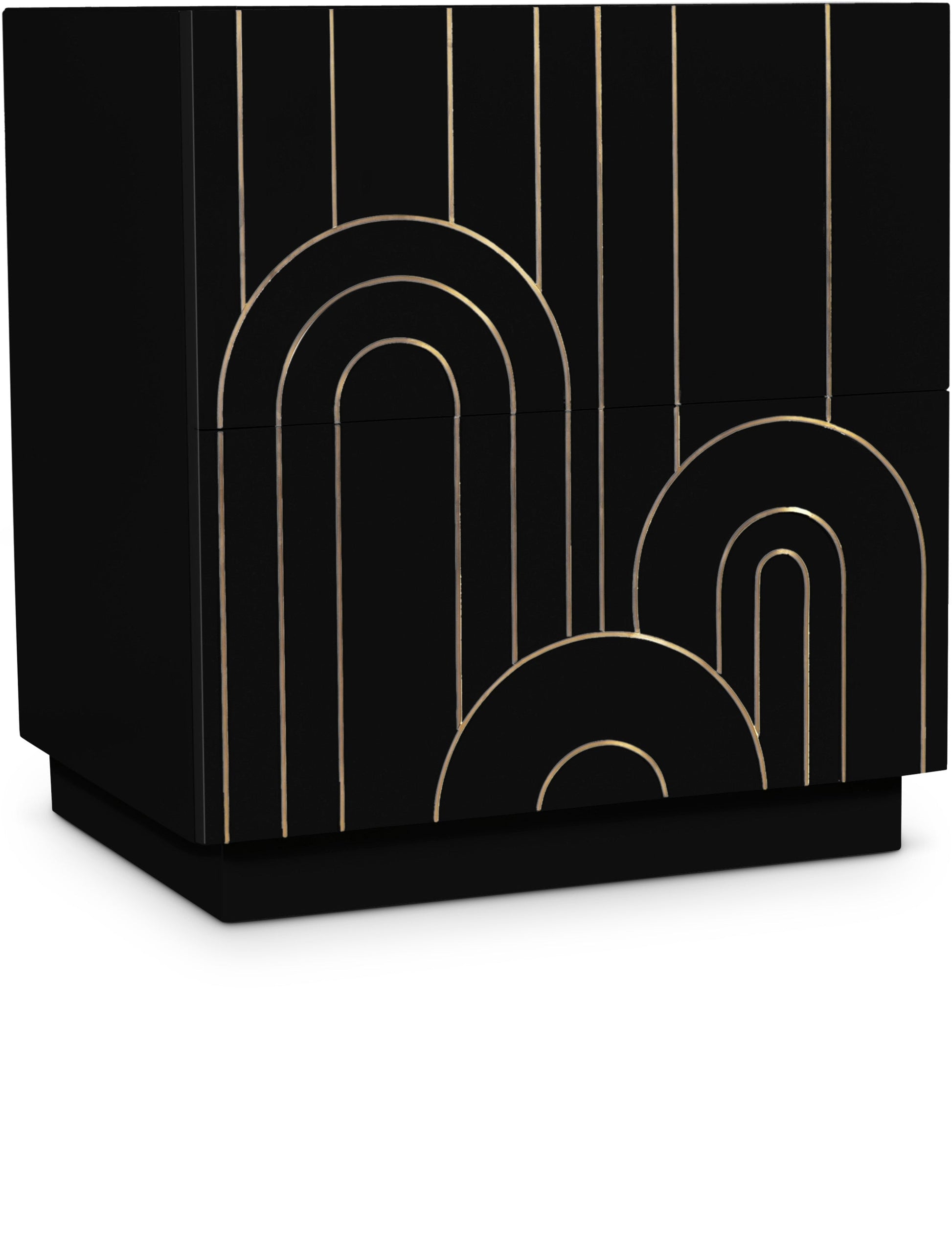 Add a bold touch to your bedroom with this stunning black Turin night stand from Meridian Furniture. Crafted from a mixture of wood and brass, this night stand is sure to be the centerpiece for your bedroom. It features two drawers so you have ample storage space for your glasses, books, medications, or other bedside essentials, providing you with additional storage in your bedroom. Its black finish is complemented with arched brass inlays, making this night stand a unique touch to your living space.