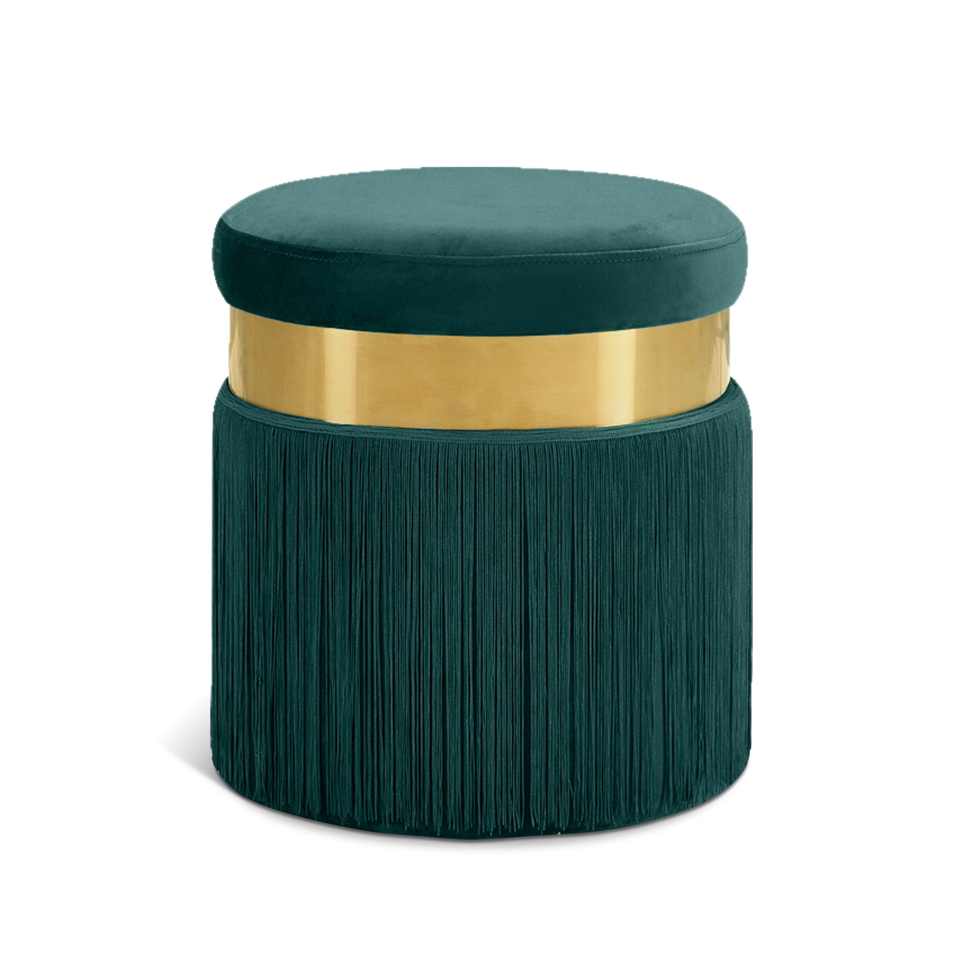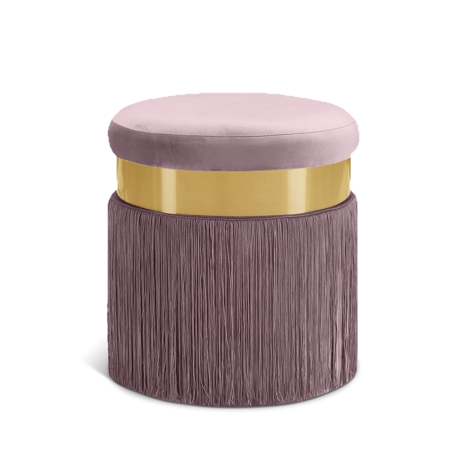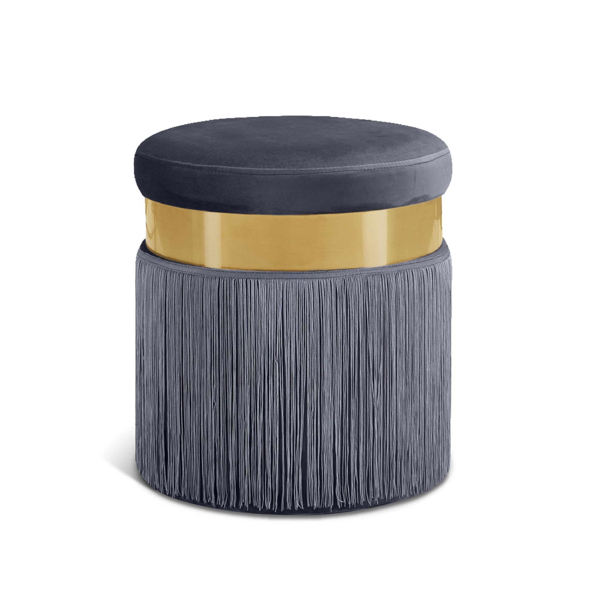 Glam it up with this Yasmine Grey Velvet Ottoman/Stool. An elegant design marries traditional design elements with contemporary panache, with the result being this fabulous stool that will become the center of attention wherever you use it. The top of this beautiful stool is covered in velvet for a chic sophistication and soft comfort as you sit. The bottom is outfitted with thin tassels for added texture and fun, and a stainless steel band intersects the top and bottom to form an interesting and visually stunning contrast.