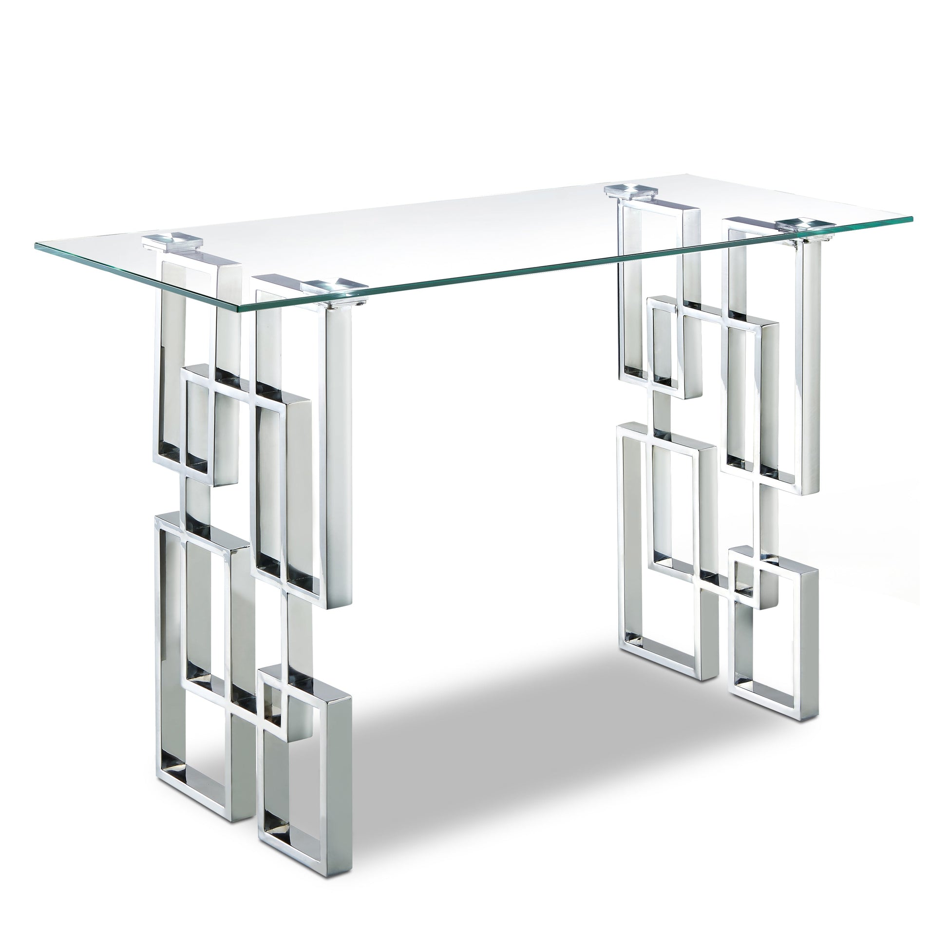 Enjoy a contemporary look in your living room or den with this stylishly elegant Alexis chrome console table. This Meridian Furniture table is made from glass and metal for a sleek, modish look. The base features a geometric design with intertwined squares that form two pedestals. The top is crafted from thick, clear glass that allows the beauty of the base to shine through completely. A chromed finish shores up the design, adding to its up-to-the-minute feel.