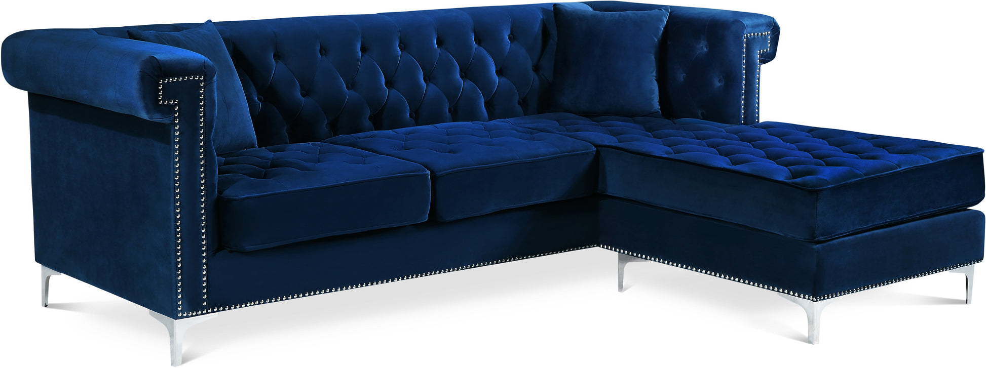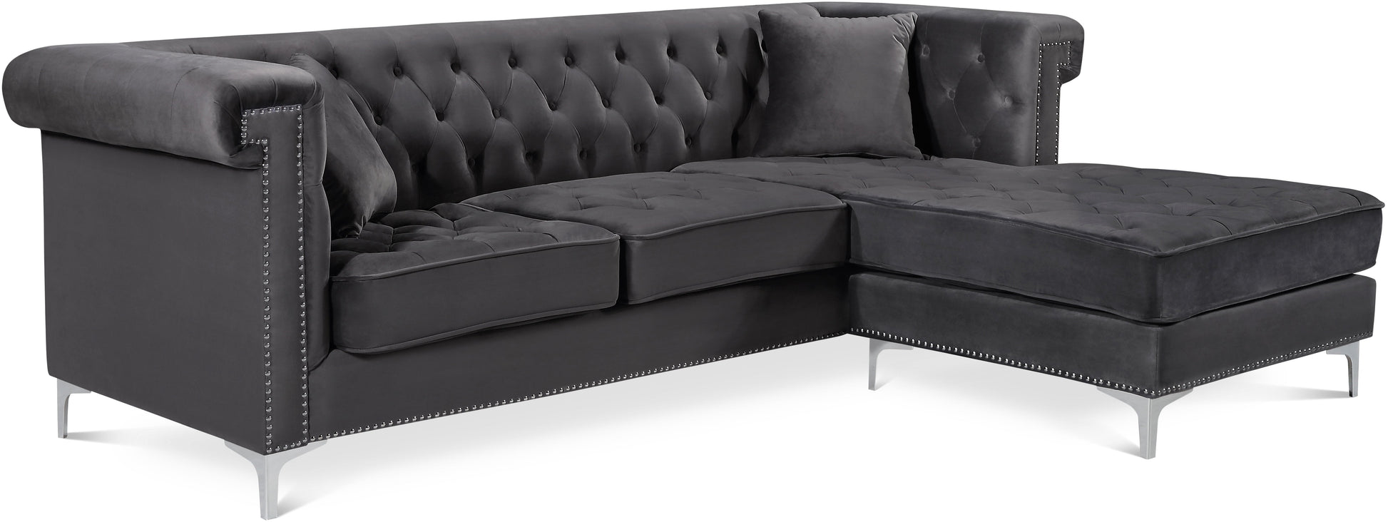 Curl up and take it easy on this two-piece Damian black velvet reversible sectional sofa. A reversible chaise on one end ensures you have a perfect spot for a nap, and the sectional seats the whole family, making it easy to stay comfortable while you hang out. The deep black color makes this sectional sofa easy to coordinate with existing items in your home, and its plump backs and plush seats ensure that this piece quickly becomes everyone's favorite seat.