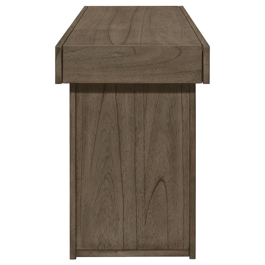 Infuse your space with simple, no-nonsense style. Delivering bold lines and crisp angles, this modern sofa table is a sturdy and stylish choice. Its wheat brown finish offers an effortless match for a wide variety of color palettes. A wire-brushed Mindy veneer adds a subtle touch of classic appeal. Complete with a hidden felt-lined drawer on smooth metal glides, this gorgeous piece offers the added bonus of concealed storage space for valuable essentials.Options and Dimensions