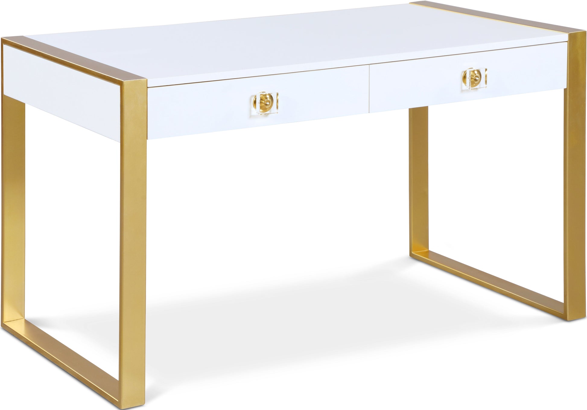 Be productive and stylish at the same time when you're seated at this Victoria desk. Designed to pull double-duty as a console table, this conveniently versatile desk offers two drawers for holding all the supplies you need to get your work done. An ample top surface gives you room for your laptop or other equipment. A high-end lacquer finish keeps the desk's beautiful demeanor despite your hard work, and brushed gold legs and acrylic handles lend the desk a definitive modern look.